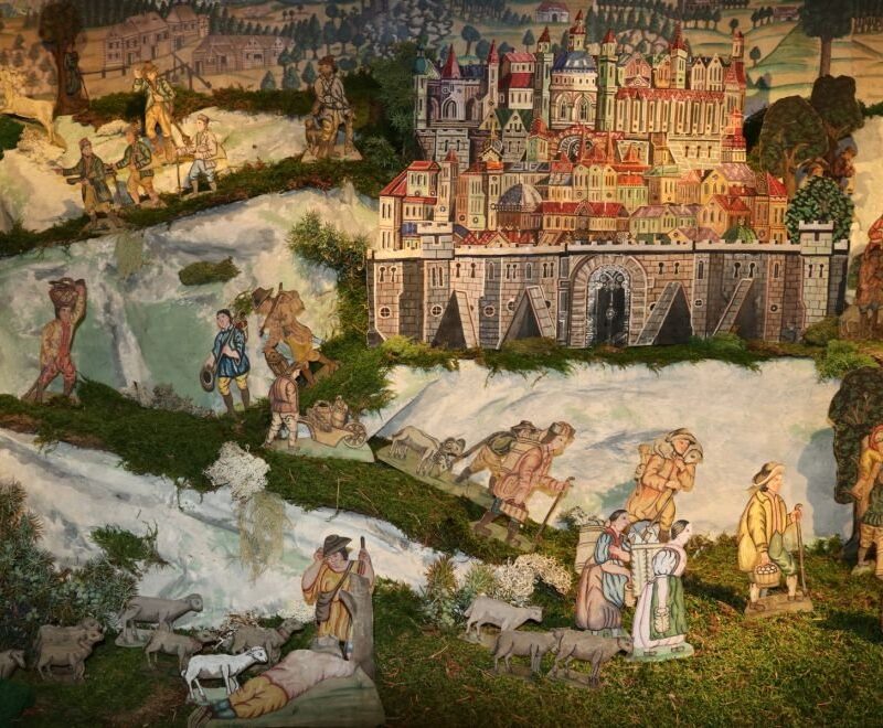 Das besondere Schaustück der Ausstellung ist eine große und wertvolle Landschaftskrippe aus dem Bestand der Diözese Regensburg. Die Leihgabe, die Herr Bischof Dr. Voderholzer dem Egerland-Museum dankenswerter Weise zur Verfügung stellt, stammt aus Nordböhmen, genauer gesagt aus Königswalde in der Nähe von Schluckenau. Hier lebte Josef Kindermann, der die naturgetreuen Figuren zwischen 1920 bis 1930 von namhaften nordböhmischen Schnitzern anfertigen ließ. Regelmäßig baute er die Krippe in der Tradition der nordböhmischen Landschaftskrippe zu Hause auf. Bei der Vertreibung der Sudetendeutschen wurden Figuren und Krippenteile unter Lebensgefahr von der Familie Kindermann in die neue Heimat nach Mecklenburg geschmuggelt. Über weitere Orte gelangte die Krippe bis nach Wiesbaden. Schließlich übereignete Pfarrer Karl Kindermann, der Sohn von Josef Kindermann, die Krippe an die Diözese Regensburg. Zur Freude des Egerland-Museums und der Stadt Marktredwitz nimmt Herr Bischof Dr. Rudolf Voderholzer höchstpersönlich an der Ausstellungseröffnung im Rahmen eines Pressegesprächs am 29. November 2018 im Egerland-Museum teil.