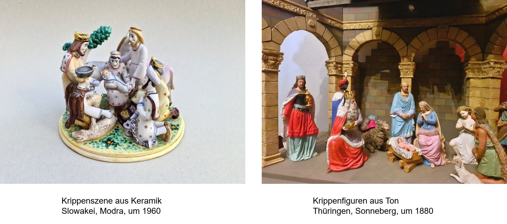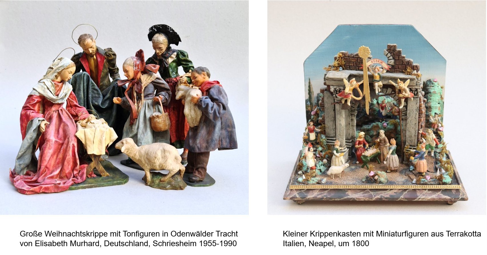 Die Bandbreite der ausgestellten Krippen aus Ton ist groß. Sie reicht von Kirchenkrippen bis hin zu Miniaturkrippen. Was Deutschland betrifft, handelt es sich um kunsthandwerkliche Produktionen. Sie stammen aus den keramischen Werkstätten verschiedener Krippengegenden, wie zum Beispiel Schwaben, Rheinland, Odenwald und Thüringen. Besondere Schätze sind große Landschaftskrippen aus Ischia oder der Provence.